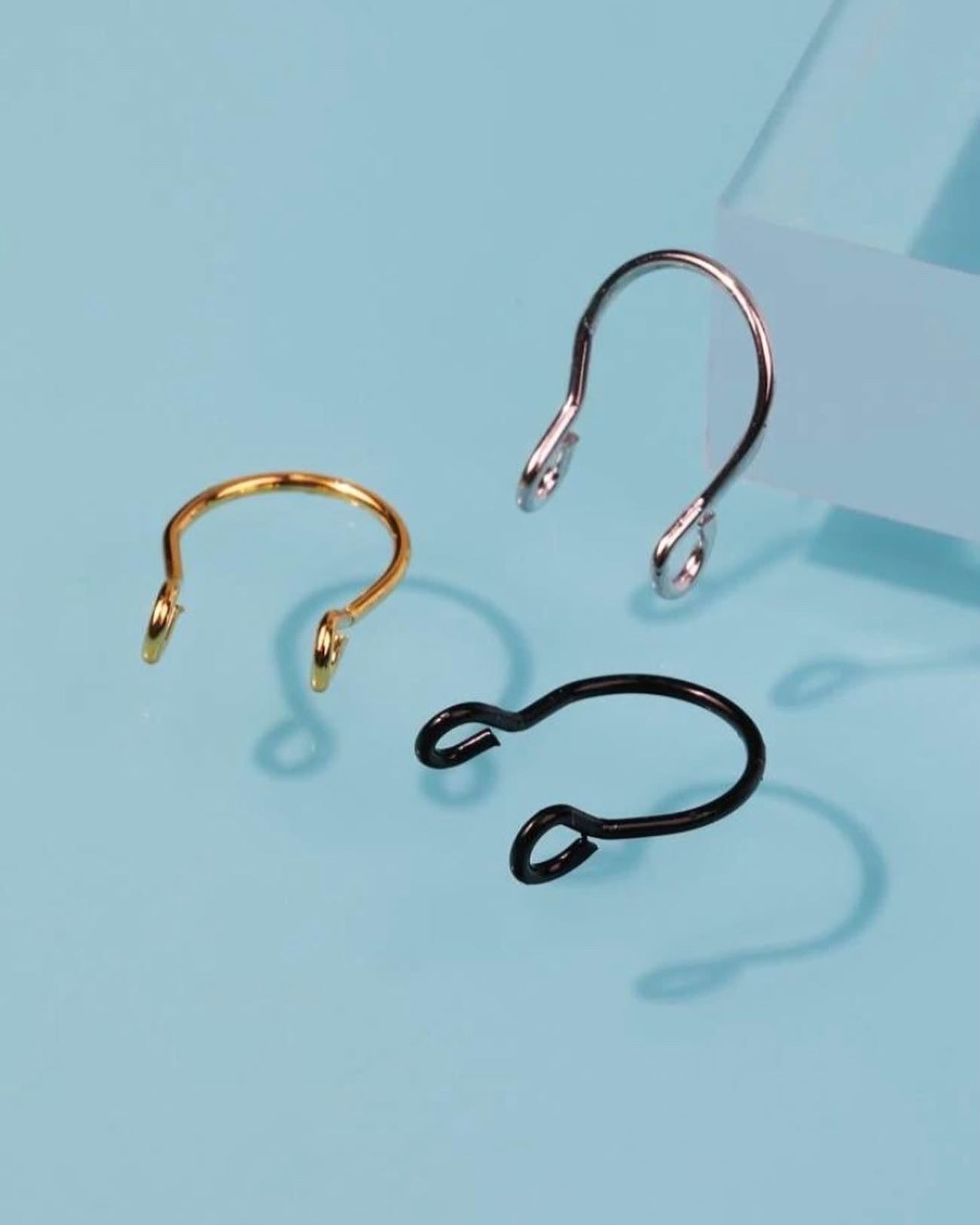 3 multi-colored septum cuff set. No septum piercing required. Comes in colors gold, silver, and black. Set of 3.