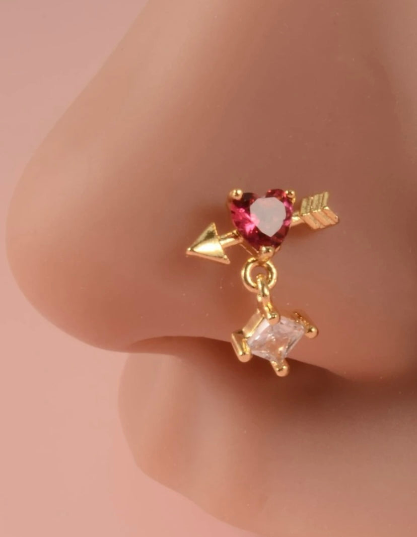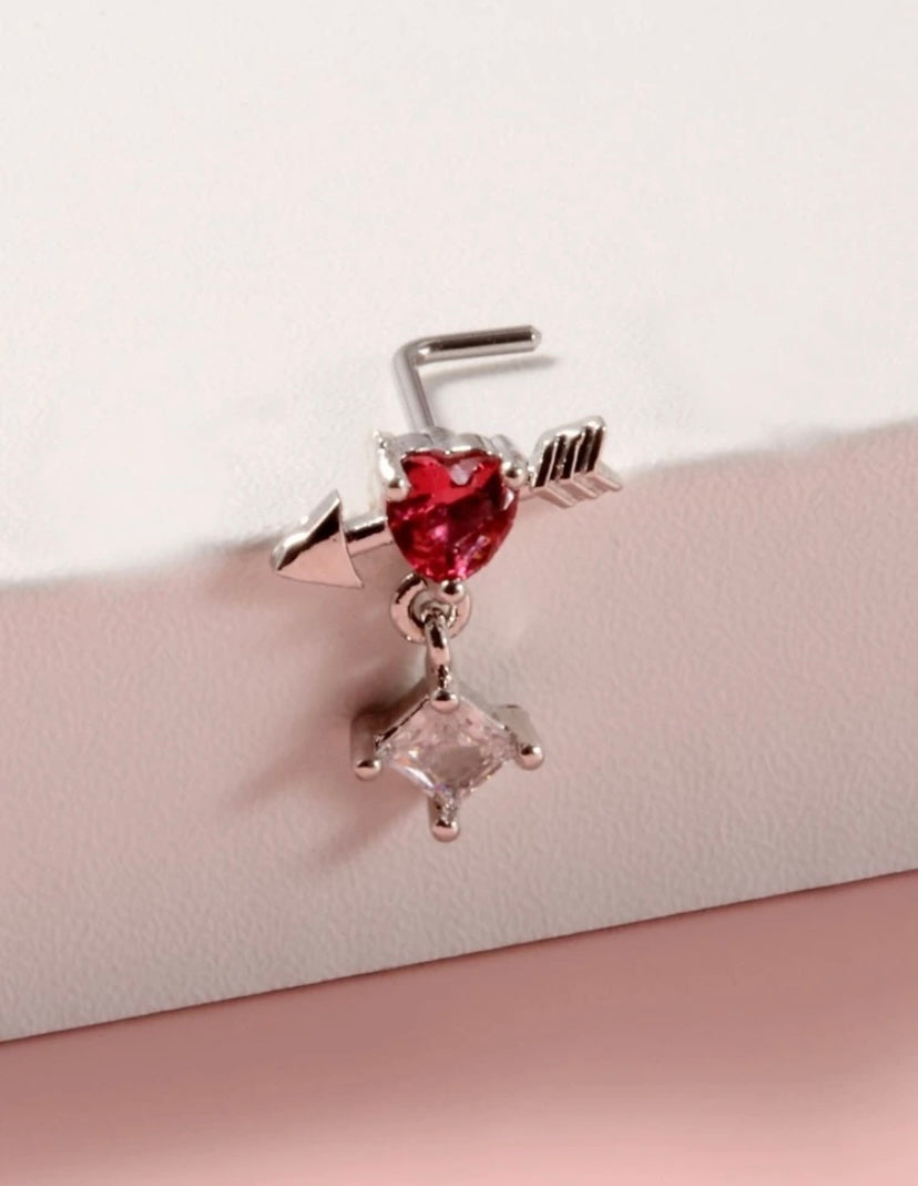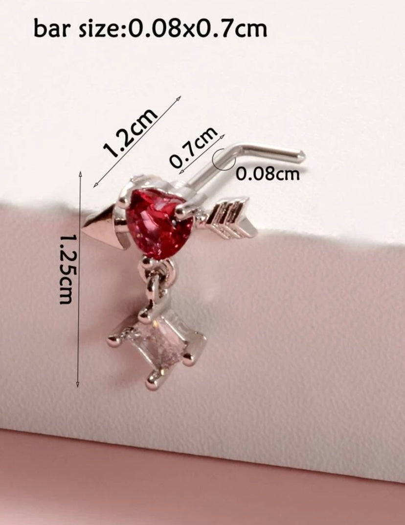 Pink Cupid rhinestone nose stud. A nose piercing is required. L shaped. Available in silver or gold. (20 gauge)