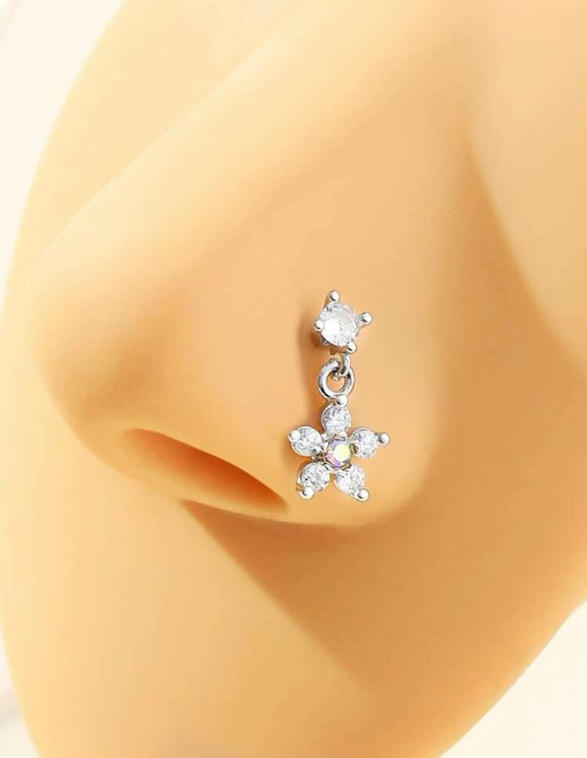 Silver flower rhinestone nose stud, nose piercing is required. 20 gauge. non-tarnish. surgical steel.